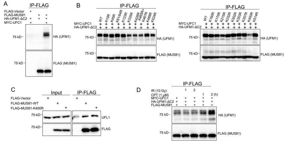 Full size imageAs MUS81 contains 20 lysine (K) residues, we constructed FLAG-tagged MUS81 mutants to identify the UFMylation site(s) of MUS81 (Fig. 1B). We found that the K335R, K426R, and K465/467R mutants resulted in reduced MUS81 UFMylation compared with MUS81-WT (Fig. 1B). UFMylation assays further confirmed that the K335R, K426R, K465R, and K467R mutants led to reduced MUS81 UFMylation compared with the MUS81-WT (Supplemental Fig. 1A-C). Interestingly, we found that mutation of K400 to arginine (K400R) almost completely inhibited MUS81 UFMylation (Fig. 1B). We thus concluded that K400 is the main UFMylation site of MUS81 (Fig. 1B and Supplemental Fig. 1A-C). As UFL1 is currently the only known E3 ligase for UFM1, we examined whether both MUS81-WT and the K400R mutant interact with UFL1. Co-IP studies demonstrated that both MUS81-WT and the K400R mutant interacted with UFL1 (Fig. 1C), confirming that MUS81 was modified by UFM1 at K400.