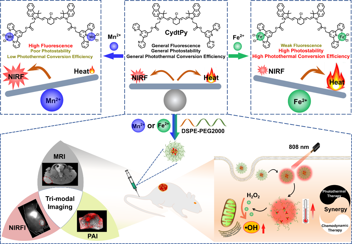 此外,该团队在Science合作综合性期刊《Research》(影响因子11.036,中科院一区,TOP期刊)上发表了题为《Terpyridine Grafted Nitrogen Terminal Endowing Cyanine with Metal Ions-Regulated Photophysical Properties for Cancer Theranostics》的研究论文。澳门博彩在线 博士后朱俊飞为第一作者,黄鹏教授、林静教授为通讯作者,深圳大学为唯一完成单位。该工作报道了一种三联吡啶(tPy)修饰近红外染料七甲川菁(Cy7)杂环氮原子的分子(CydtPy)与金属离子(如Mn2+、Fe2+、Cu2+、Co2+等)螯合实现光物理性质可调。通过简单的切换CydtPy与不同金属离子螯合,可用于活体荧光成像、磁共振成像或光声成像。此外,与Fe2+螯合的复合物在体内外均表现出优异的光热和化学动力协同治疗效果。