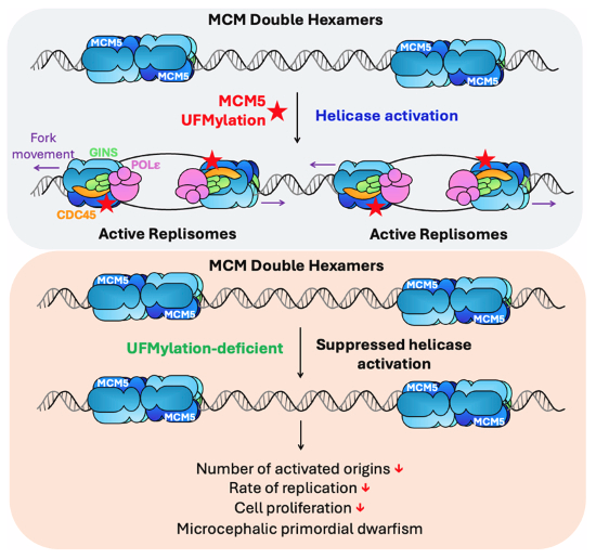 近日,澳门博彩在线 许兴智教授团队和Shunichi Takeda教授团队联合在《The EMBO Journal》期刊发表了题为“MCM5 UFMylation regulates replication origin firing and fork progression”的研究论文。该研究首次揭示了UFM1修饰系统(UFMylation)通过修饰DNA解旋酶复合体CMG的核心组分MCM5,调控DNA复制起始与复制叉进程的新机制,并阐明了该通路缺陷导致小头畸形原始侏儒症(microcephalic primordial dwarfism, MPD)的分子基础。这也是许兴智教授团队继在国际上率先诠释UFMylation调控DNA损伤应答(Nucleic Acids Research 2019)、细胞自噬(Autophagy 2024)、DNA复制胁迫应答(PNAS 2024)之后的又一突破。澳门博彩在线 基础医学院副研究员李政、博士后伍星璇为论文共同第一作者,许兴智教授和Shunichi Takeda教授为共同通讯作者。