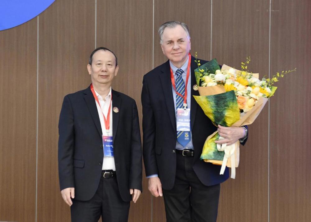 会议在庄重的开幕式中拉开帷幕。开幕式由澳门博彩在线 执行主任许兴智主持。许兴智教授首先对与会专家学者表示热烈欢迎,并简要介绍了本次会议的重要意义。深圳大学校长毛军发在致辞中向巴里·马歇尔教授致以崇高敬意,强调了本次会议在推动学科融合与创新发展方面的重要作用。学生代表向马歇尔教授献上鲜花,表达对这位科学巨匠的深深敬意。随后,巴里·马歇尔教授作了题为"理论与实践"的首场主旨报告,回顾了幽门螺杆菌发现四十年来的科研历程,分享了其在临床转化中的应用成果。